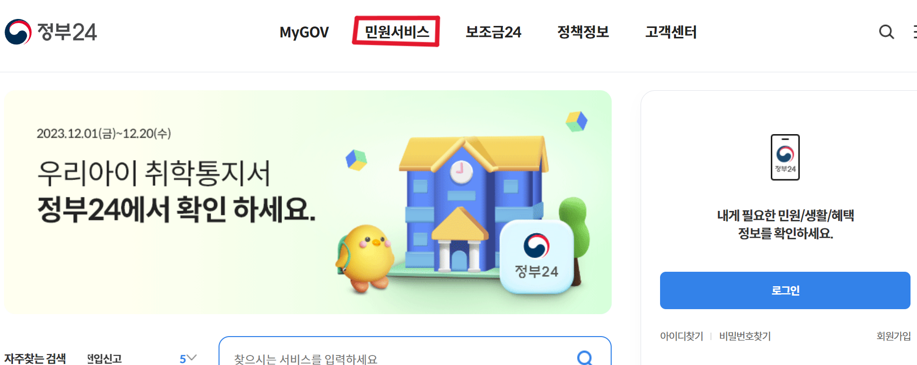 <검색을 클릭한 후 민원신청하기를 클릭한다. 그리고 신청한 내역은 MYGOV에서 조회 후 출력이 가능하다>
